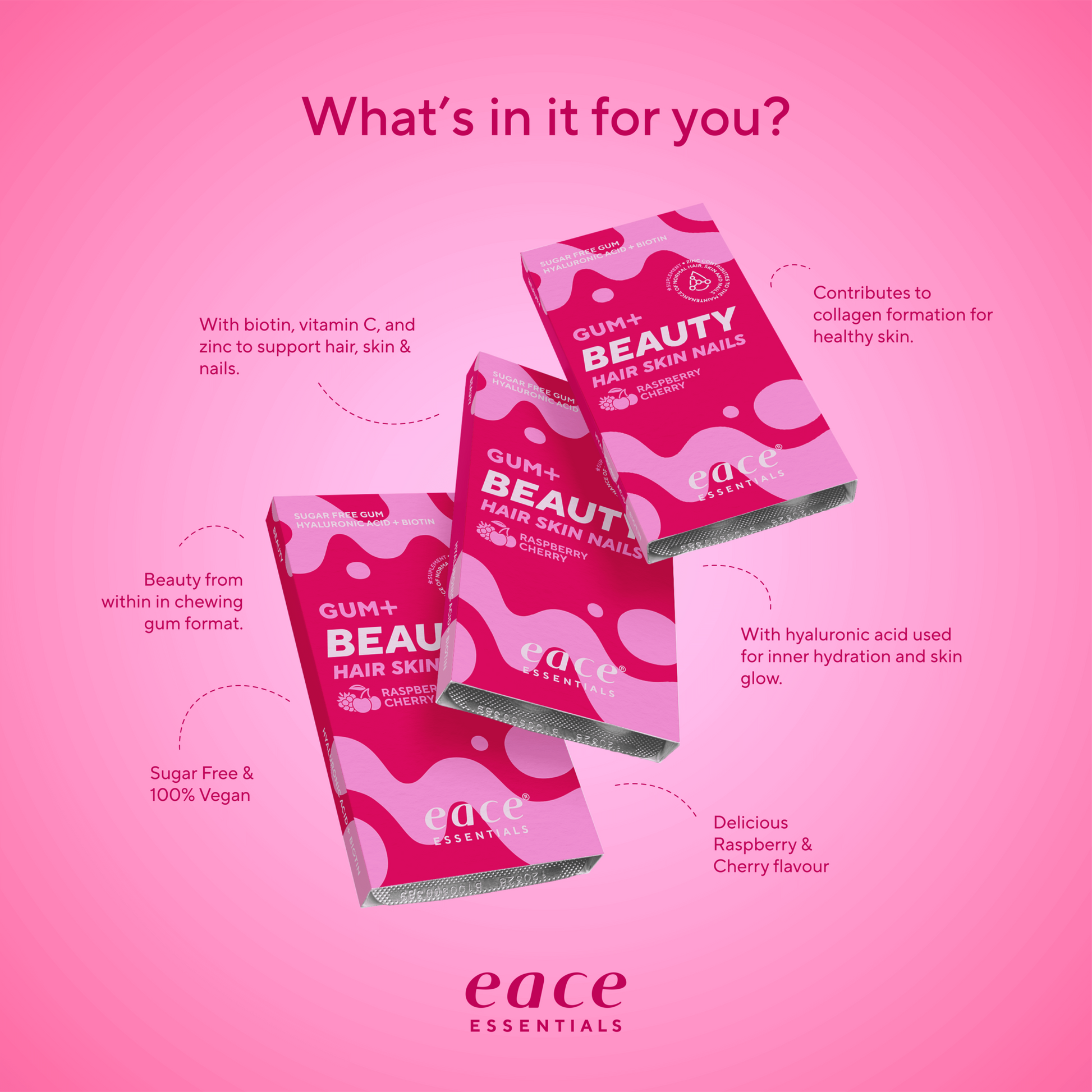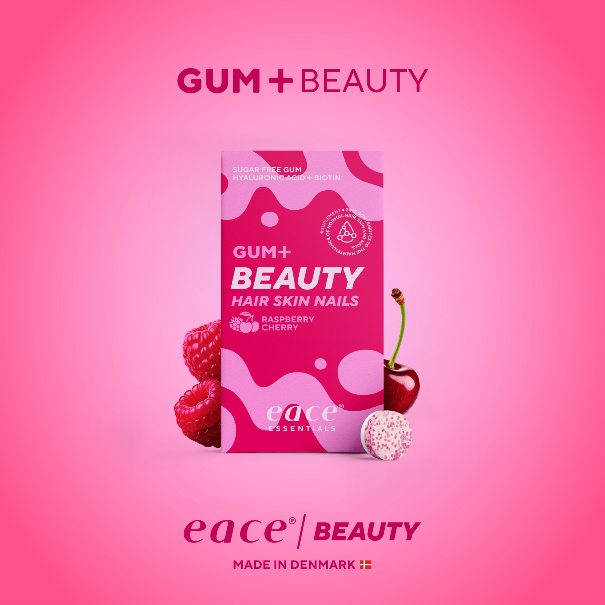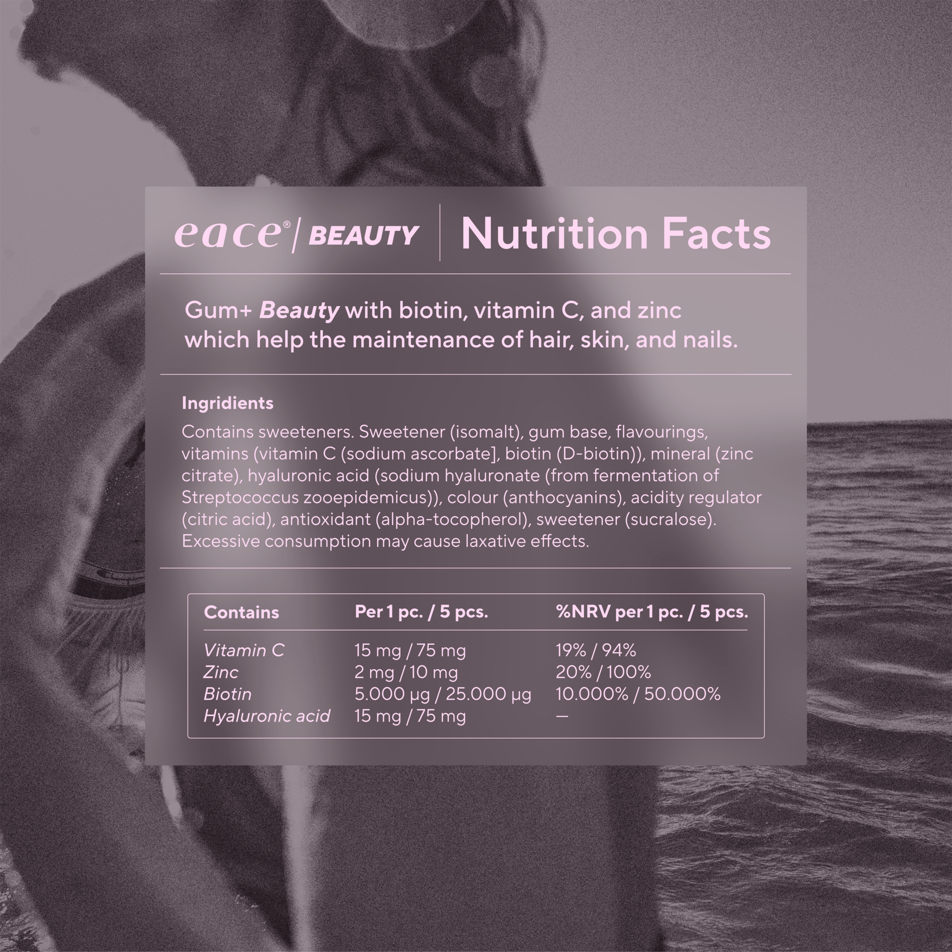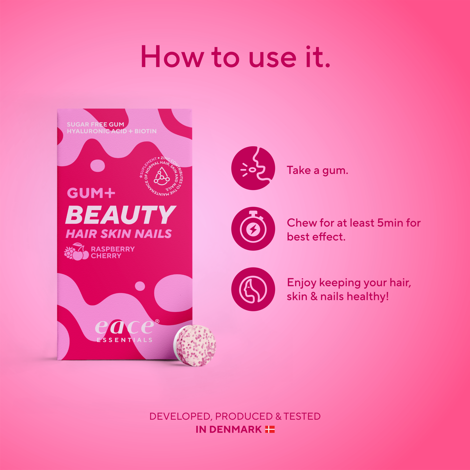 Indeholder hyaluronsyre, biotin, zink og C vitamin – alt det din hud, hår og negle elsker. Frisk smag af hindbær med et strejf af kirsebær. 8 tyggegummier pr. pakke.