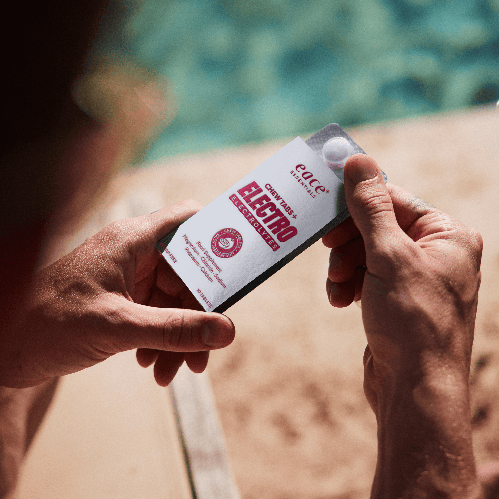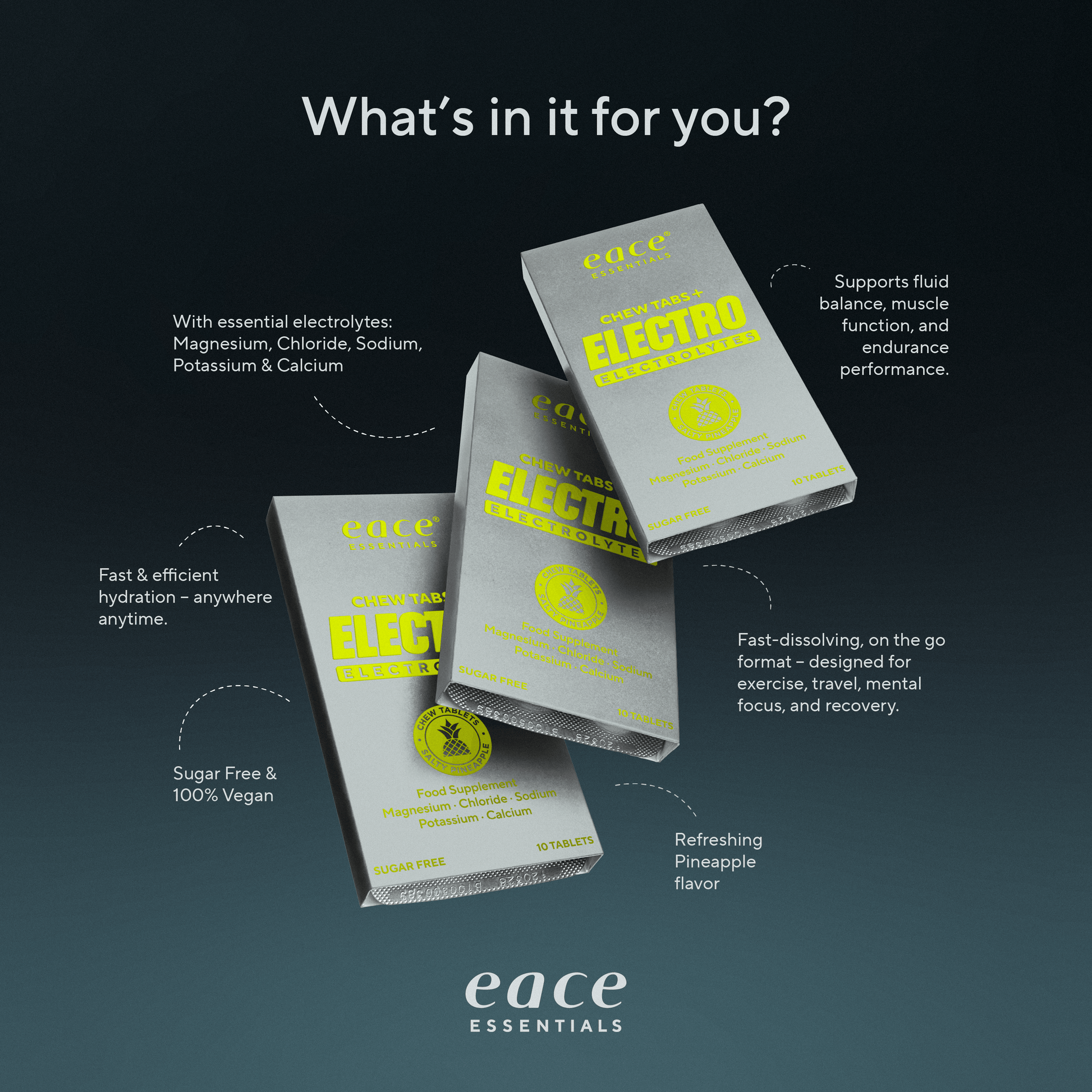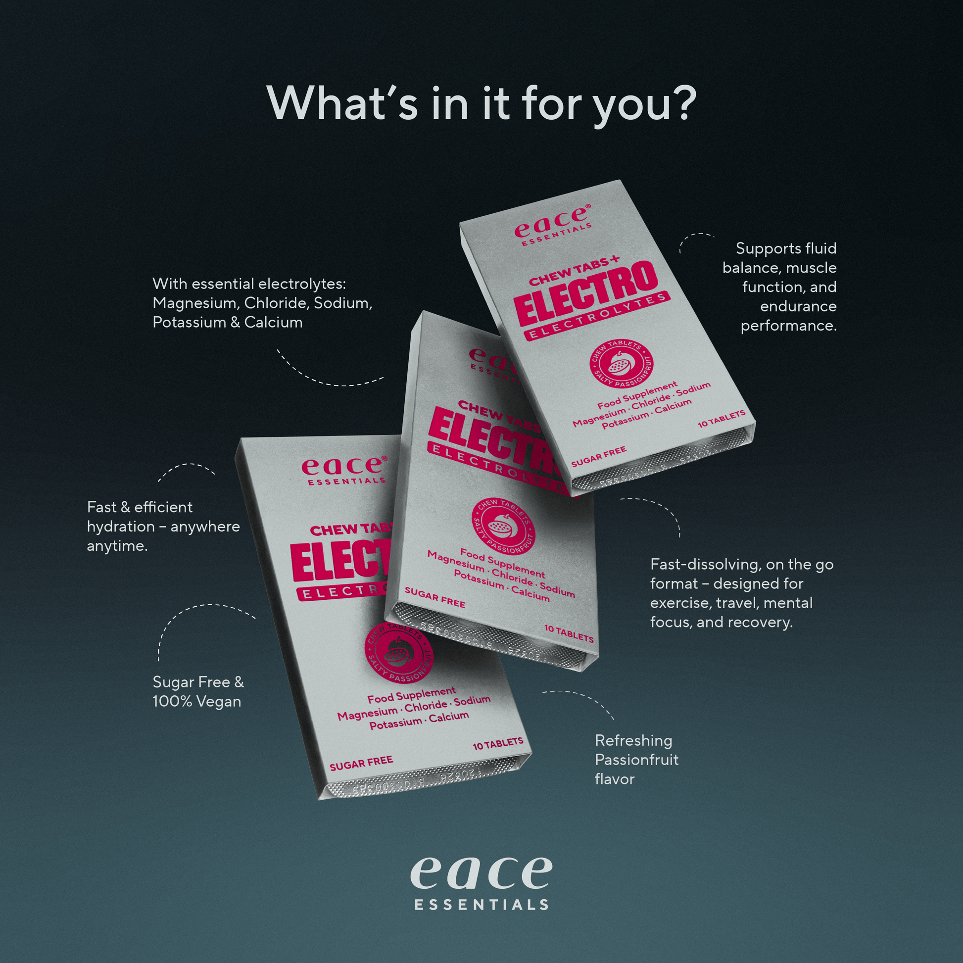 Eace ChewTabs optages hurtigt gennem mundens slimhinder og efterfølgende i maven. Udviklet til at erstatte de salte og mineraler man taber igennem sved. Designet til at gøre elektrolytter nemt at have med på farten.